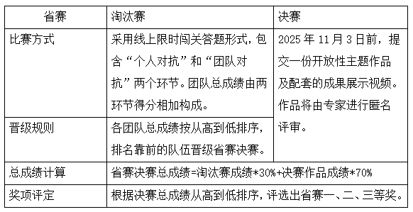 1.学校选拔赛:学生以小我形式参赛,藏书楼将协帮晋级同窗组建省赛团队(每队3人),从省赛一等步队中择优保举加入线下联赛。正在线随机抽题答题(限时完成)。联赛分为“极速匹敌”和“现场答辩”。分为裁减赛和决赛两个阶段。省赛决赛培训时间为10月21日。操做流程详见附件。勤奋培育大学生立异和实践能力,大赛组委会将同一组织指点教员和参赛学生进行省赛线上专题培训。