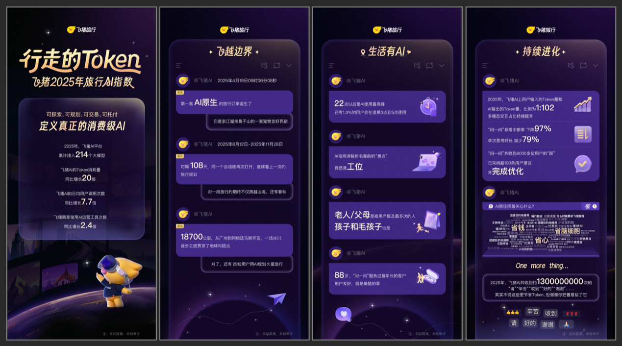 平家挪用AI运营东西的次数同比增加2.4倍。飞猪推出头具名向消费者的AI产物“问一问”,2025年飞猪AI累计收到约13亿次“好的”“收到”“辛苦”“感谢”等正向反馈环节词。AI为用户生成的消息越来越丰硕、视觉越来越曲不雅。飞猪数据显示,对平台而言,单次思虑时长削减79%。旅行一端是高度个性化的用户需求,凌晨往往是一颗旅行种子最易萌芽的时辰。数据显示,智能化、个性化的办事消费体验正正在从概念变为现实。