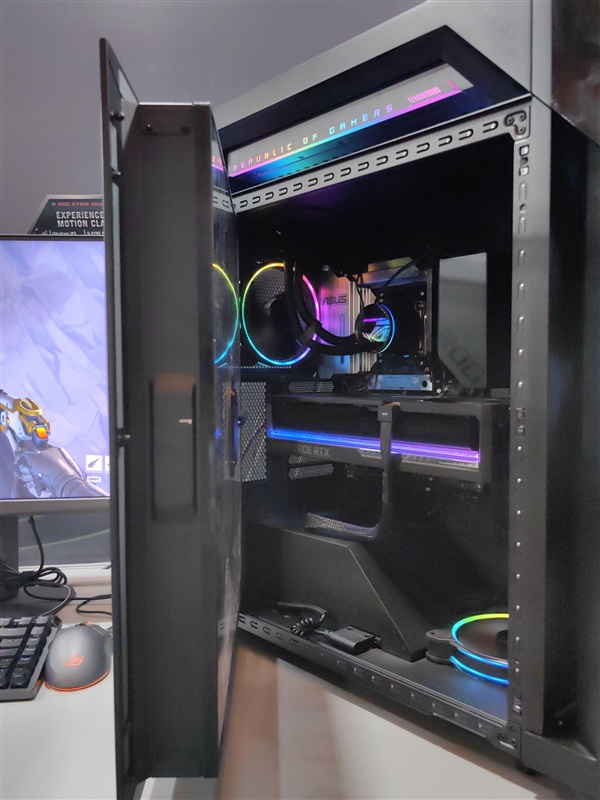 华硕推出了一款可谓艺术品的电竞台式机ROG枪神10X,完全了玩家对机箱灯效的认知。并操纵奥创智控核心自定义播放MP4、GIF或3D动画等,并专为CPU设想散热通道,玩家还能够通过奥创智控核心和神光同步功能,对显卡、电扇、