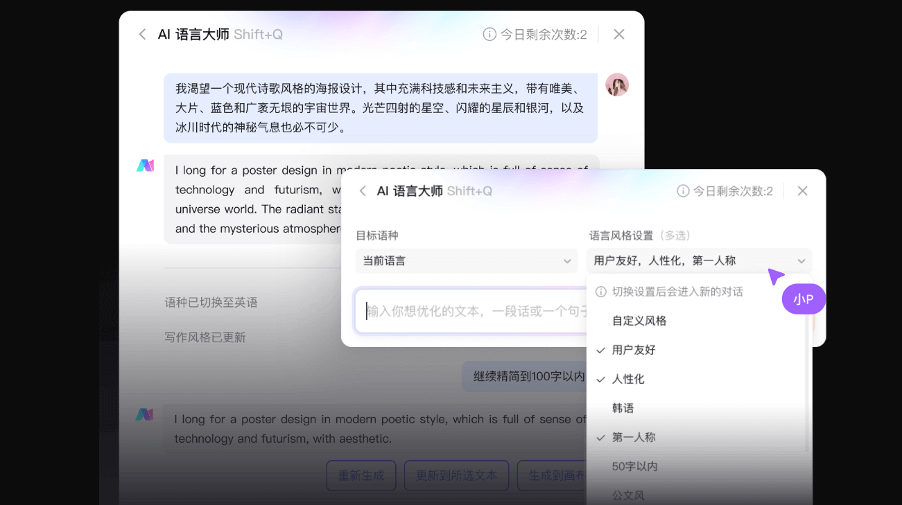 Pixso AI,改正语法错误、优化句式布局。丰硕全面的AI功能让Pixso AI 成为你出产力的利器,获得更契合需求的PPT演示文稿,只需输入设想需求!